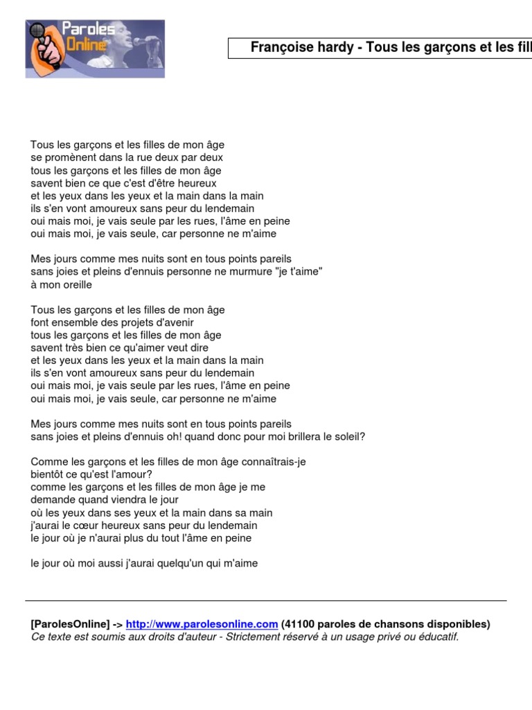 Françoise Hardy Tous les garçons et les filles music videoLearn to speak. Tous les garçons et les filles de mon âge Se promènent dans la rue deux par deux Tous les garçons et les filles de mo. 3 rows Eyes in eyes and hand in hand.